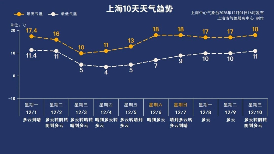 明天中午前多云到晴,下午云系增多转阴。最低气温:11℃,最高气温:16℃,相对湿度 85%~40%,依旧是干冷的调性。周三早晨,新一股冷空气抵沪,强度比今天这波更猛。一整天都偏冷,西北风一吹,体感直线下降。本轮最冷时段是周四早晨,市区最低气温约 4℃,郊区逼近冰点,局地有薄冰。周五白天起逐步回暖,周末最高气温重新回到 18℃左右。冷是冷,但还没冷到“真冬水平”,上海仍然在秋天尾巴里晃悠。